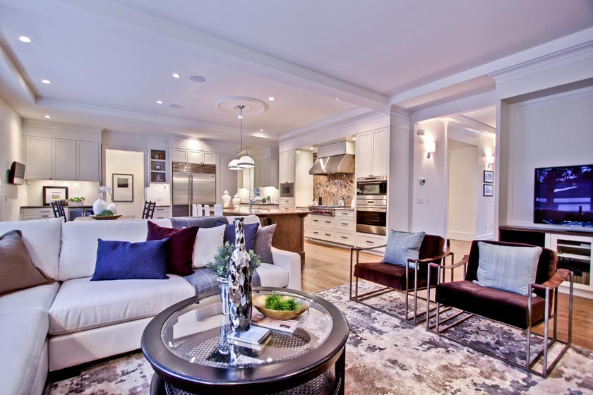 · Family room including fireplace with replica Louis XIV stone mantel open to the kitchen boasting a marble island, granite counters, Wolf oven & cook-top, Sub-Zero refrigerator and a scullery with farm-style sink and second dishwasher for out-of-the-way clean up or catering