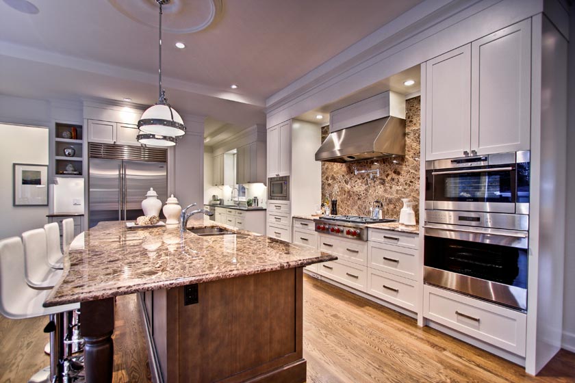 · Family room including fireplace with replica Louis XIV stone mantel open to the kitchen boasting a marble island, granite counters, Wolf oven & cook-top, Sub-Zero refrigerator and a scullery with farm-style sink and second dishwasher for out-of-the-way clean up or catering